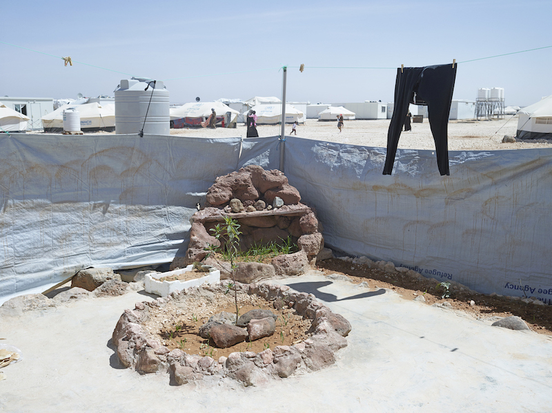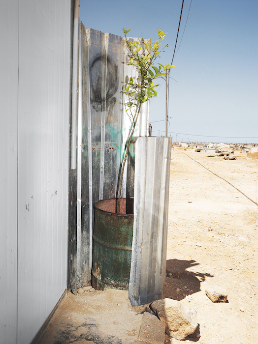 Abu Hamzi and his family fled the horrors of the war in Syria and arrived at the Zaatari refugee camp in Jordan in 2013. Abu had worked as a horticulturist in Damascus and specialized in the shaping of shrubs. He has planted a beautiful garden with flowers and lots of succulents that do well in the dry ground around his shelter in the camp. When he feels stressed, he goes into his garden. Its beauty relaxes him, he says, and caring for the garden is good for his soul. A few weeks ago he discovered a peach sprouting in the back of his garden, presumably growing from a discarded pit. Abu put crates over the young sapling “to protect it from the kids, who yank everything out of the ground if you don’t watch out.” He is hoping it will grow into a nice big tree, because that will give him shade and fruit.