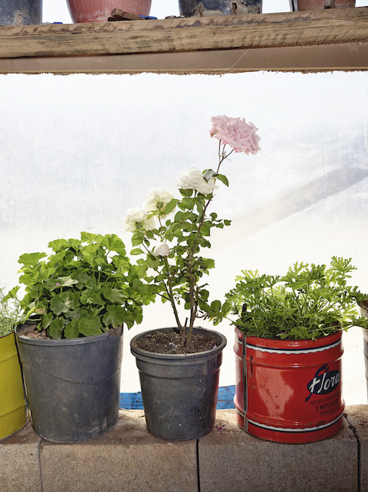 Grandma Hayat Abou Jabá has been living with her family for over two years in the Beqaa Valley, Lebanon. At home in Syria, she had a garden with many flowers and other plants. When the war came too close, she fled with her children and grandchildren, sadly leaving the garden behind. As soon as the family found a place to build a temporary dwelling, Hayat began cultivating new plants. It soon became her daily routine. Geraniums in pots now flourish in her “front room”, while roses put on a colourful display outside. Grandma Hayat’s plants play an important part in binding the family together, her daughter told me. The pleasant atmosphere created by the greenery in the front room has made it into a central place where family and friends can gather and relax. In the few years she has been in the Beqaa, Hayat has sprouted so many cuttings that she can give many away. Her plants are now spreading among her family and neighbours. Hayat does this for her own pleasure, her daughter said. An amaryllis is growing in the soil outside. It is known as a “wedding plant”, she told me, because two flowers grow on each stem.