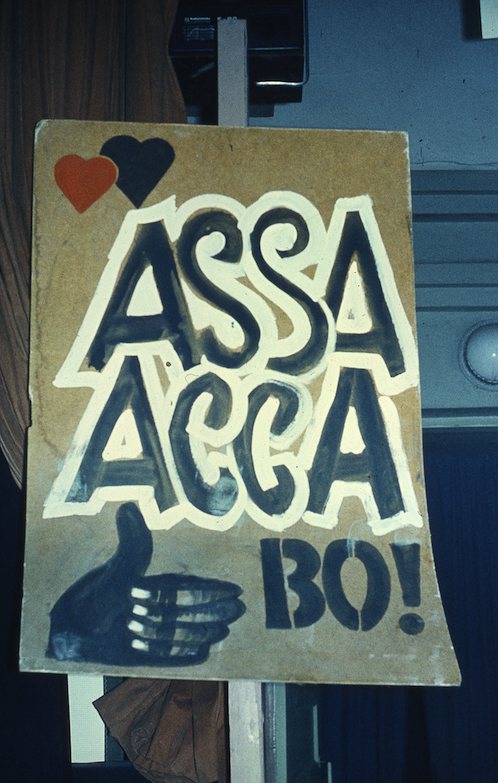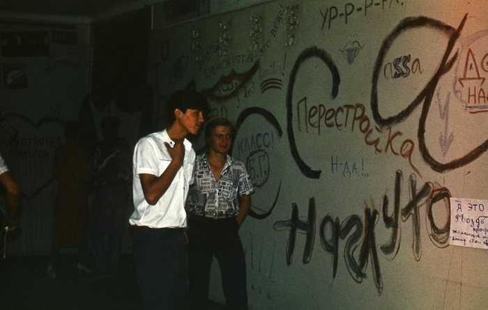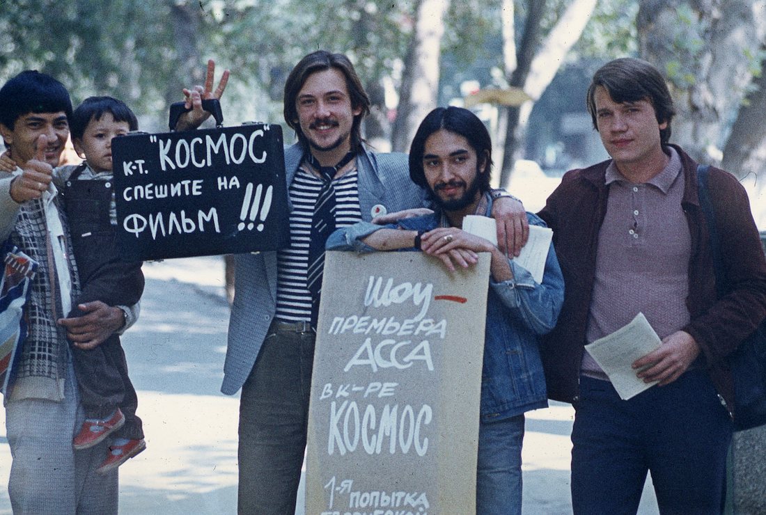 In the autumn of 1988, on the initiative of Rustam Dzhuraev (the director of that very Cosmos cinema), my friends and I organized a two-days presentation of Sergey Solovyov's film AssaAssaThe film Assa, about the adventures of a young nonconformist nicknamed “Bananan,” was released in 1987 and quickly became a symbol of perestroika. All of the main late Soviet rock musicians, such as Viktor Tsoi, Boris Grebenshchikov, and Zhanna Aguzarova, took part in recording the film's soundtrack.. Having no rock-related posters, we hung vinyl record jackets around instead. We painted graffiti on the walls of the lobby and at the cinema hall. The audience seemed to be given the green light to do it—one of the first steps on the path from “street hooliganism” to “contemporary art.” By the way, in the foyer, among other things, there was also a board into which anyone could literally “nail” their own drawing cards of the show using a hammer. In a nutshell, we were free to use our fantasies. Both professionals and amateurs could take part in the shows with bards and rockers among them . . . even schoolchildren, who, by the way, staged a semi-punk fashion show— ultramodern at that time. We even had our own “Bananan girl”! The band Sato also performed at our show.