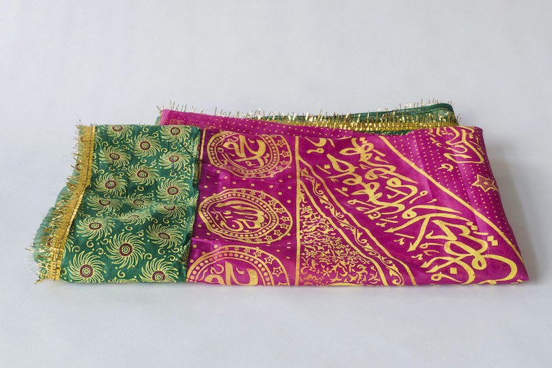 Textiles like this grave sheet are among the most common votive offerings that visitors make to saints’ shrines across South Asia. This particular multi-colored and glittery fabric depicts a prominent Sufi shrine of India along with verses from the Koran. While buying this object in the bazaar of Ahmedabad, the vendor urged me to enlighten the world beyond India about Islam as a religion and civilization.