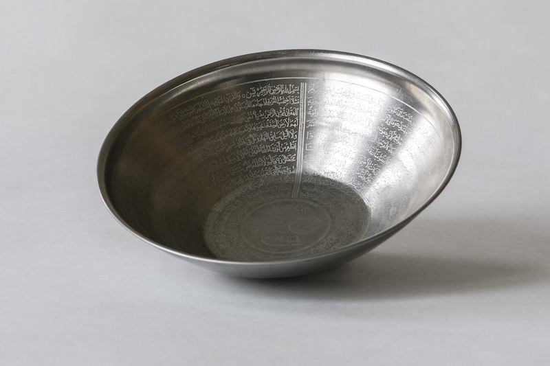 This bowl is inscribed with Surah Yasin, a chapter in the Koran, which is said to have healing power. If you have a headache, drinking water from this bowl is supposed to relieve the pain. I got this bowl from a friend from Pakistan, and another friend of mine from Sudan now frequently uses it. At the Swahili coast, where I come from, Islamic healers write the Koranic verses with saffron ink into a bowl. The ink dissolves in the water which the patient drinks.