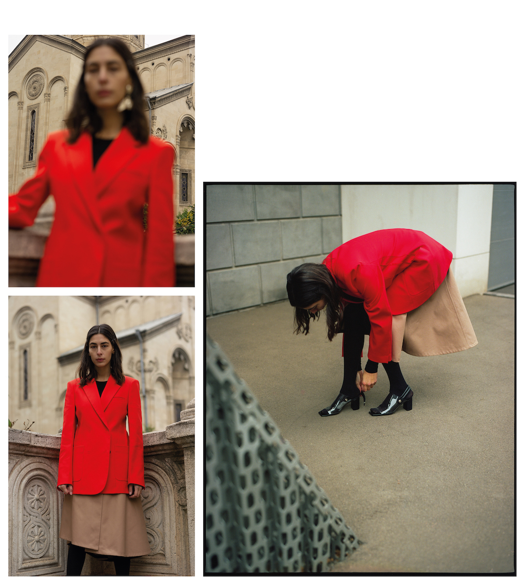 Anka sporting a skirt, blazer, and shoes by Ingorokva. Photos by Irakli Khargelia for EastEast. Tbilisi, Georgia, December 2020