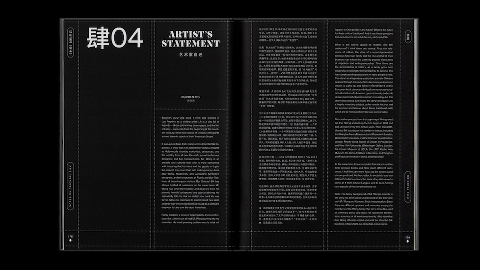 What will happen to Oriental Silk in the future? Five years ago, I was driven by this question to complete the single-channel documentary film, which was premiered at the Aurora Museum in Shanghai. Since then, I have taken the project in various forms, comprising film installation, photography, and textile design, to numerous places in the world, from Shanghai to London, from Los Angeles to Berlin, from New York to Rhode Island. This journey follows my decade-long experience of living in diaspora and the milestone is this publication featuring people, places, conversations, and stories interwoven by the meaning of Chinese silks to one immigrant family’s emotional past.