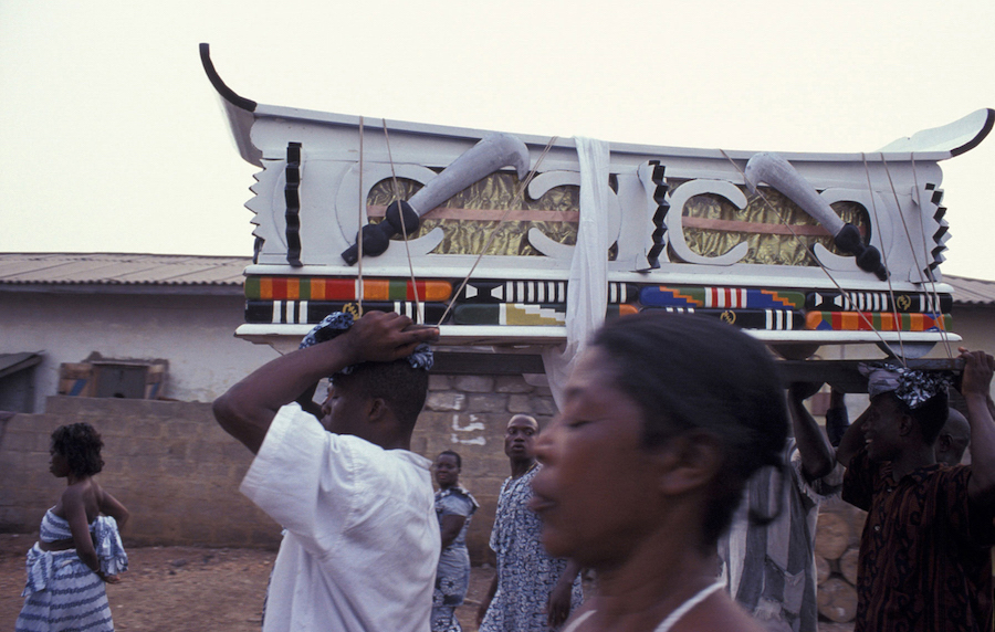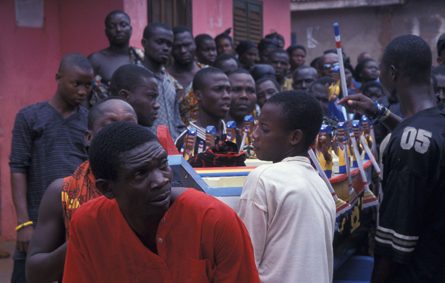 The same story was retold by Western authors until the anthropologist Regula Tschumi, through her PhD research, disproved this popular version. According to her research, the Ga people’s chiefs had long been buried in figurative coffins that repeated the shape of their ceremonial palanquins, which in turn were made in the form of their kin’s symbols. This was due to the fact that the chiefs’ initiations and funerals complemented each other. Accordingly, various carpenters had made what would later be called “fantasy coffins”—prior to Kane Kwei.