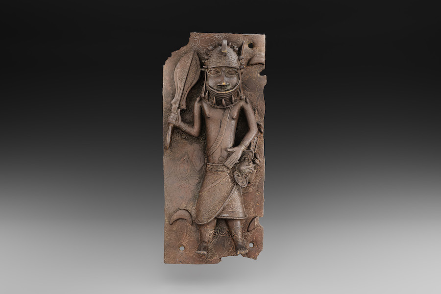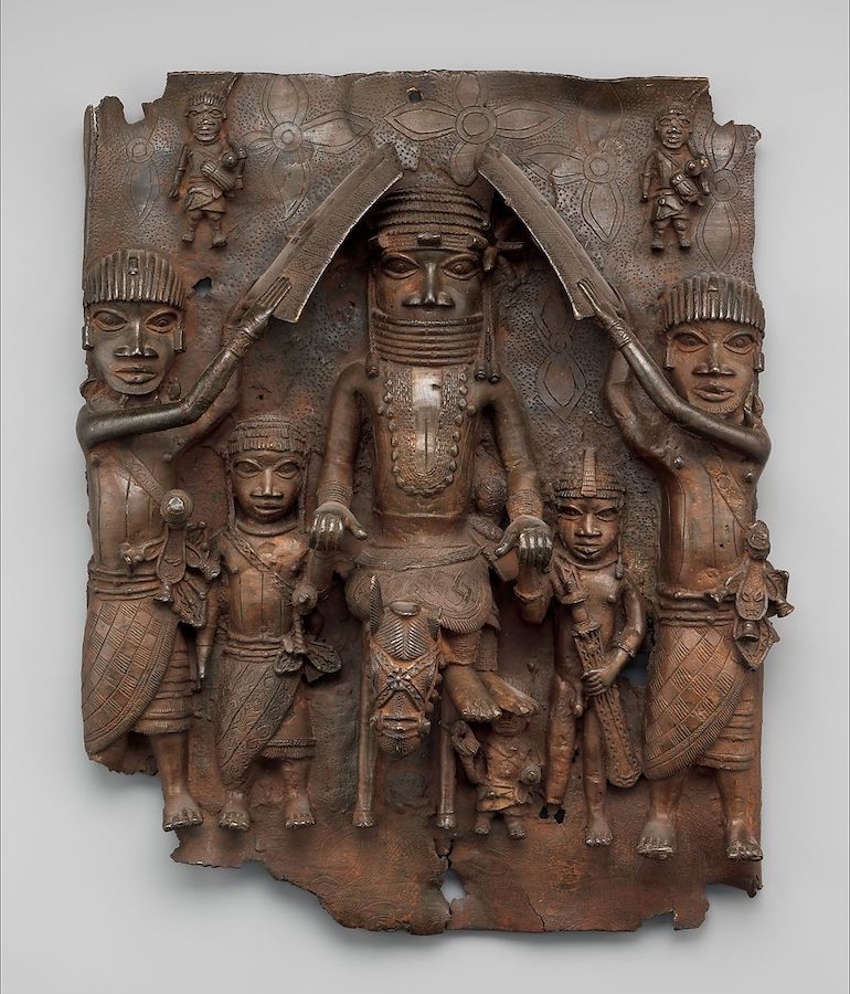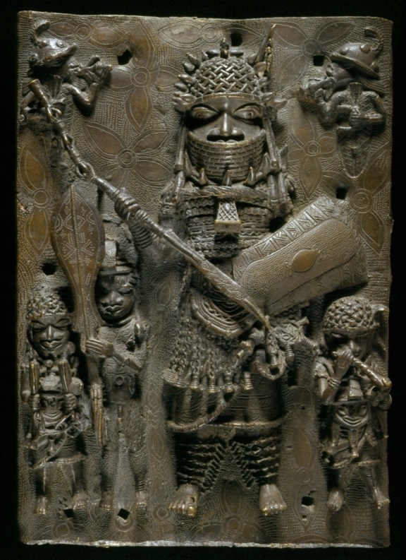 Right: Plaque with the image of the King and his servants. Benin Palace, 1550–1680