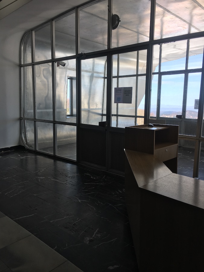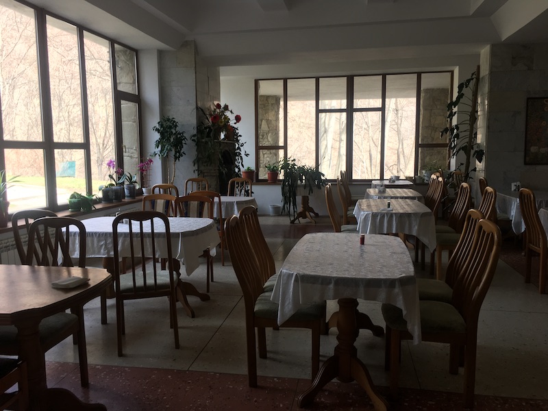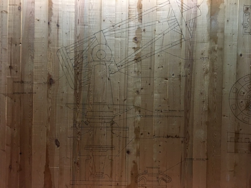 Between the glass doors, there is an announcement with information about the excursions that are sometimes offered here—an indication of the hospitality of the complex’s employees and its unstable habitability. Ekaterina turns on the light and on the ceiling the stained-glass window made artists from Riga is illuminated. Uneven glass fragments were specifically brought to Nizhny Arkhyz for this composition. The plot is obvious—zodiacal constellations and an astronaut with wings, referring to the myth of Icarus. The same images can be found at BaikonurBaikonurThe Baikonur Cosmodrome is a spaceport in an area of southern Kazakhstan leased to Russia., in the monumental complex “Glory to the Conquerors of Space.”