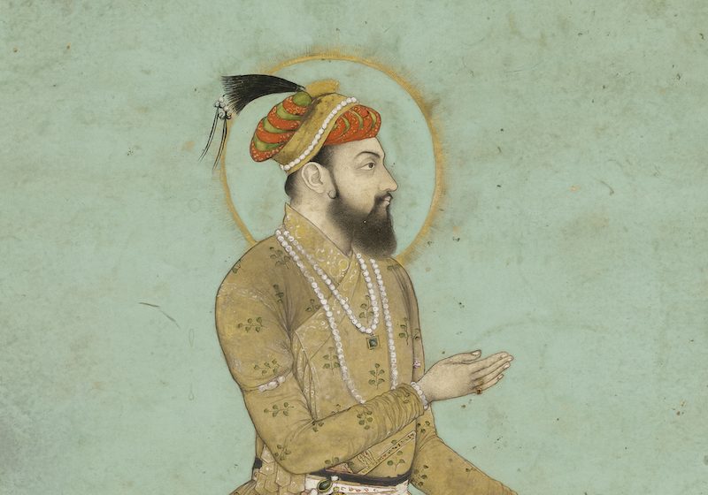 A string of beads under the hat was an obligatory element in Iranian jewellery-making starting in the 15th century. A string of pearls was worn under the chin and attached to the hat or to pendants. In addition to pearls, the beauty in this portrait is also wearing emeralds, spinel (a red colored jewel), and rubies.