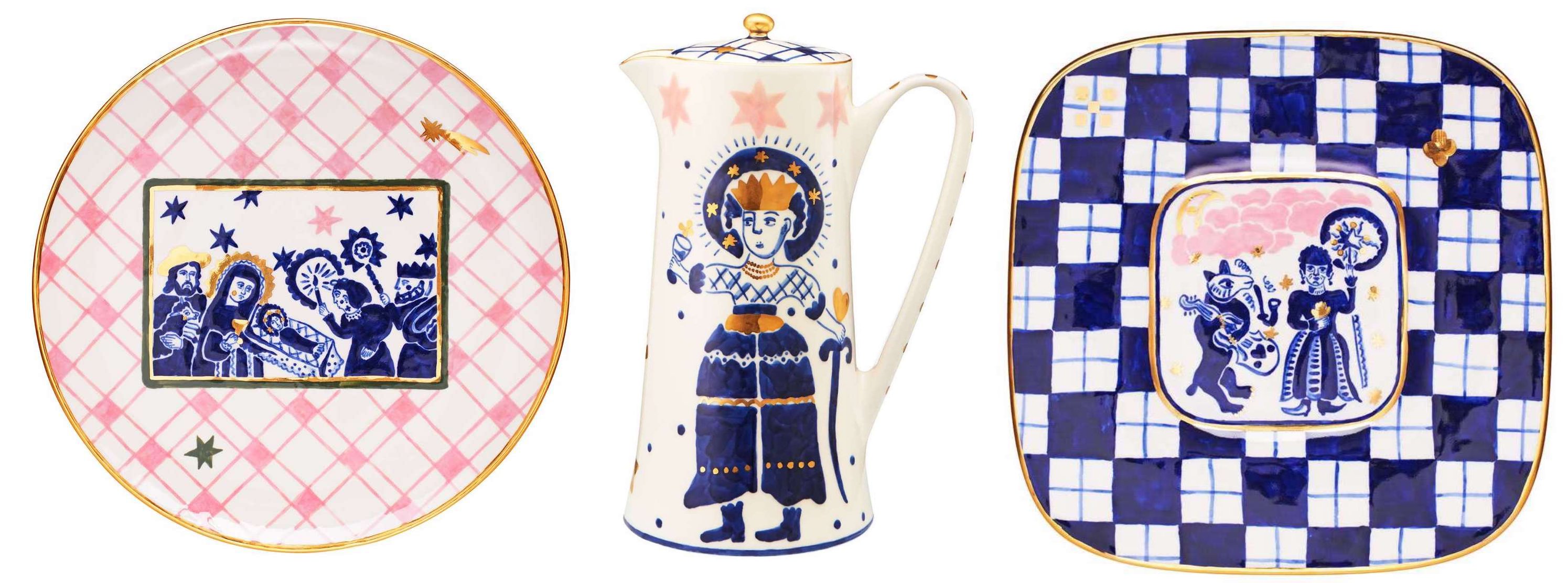 Dishes featuring scenes from Ukrainian Christmas rituals. The designs are inspired by real monuments from churches and the festive symbolism of folk iconography. The images are hand-painted on porcelain and are based on 17th-century stone slabs from the Ivano-Frankivsk region, wooden altar crosses from Bukovina, and Christmas cookies from the Poltava region.