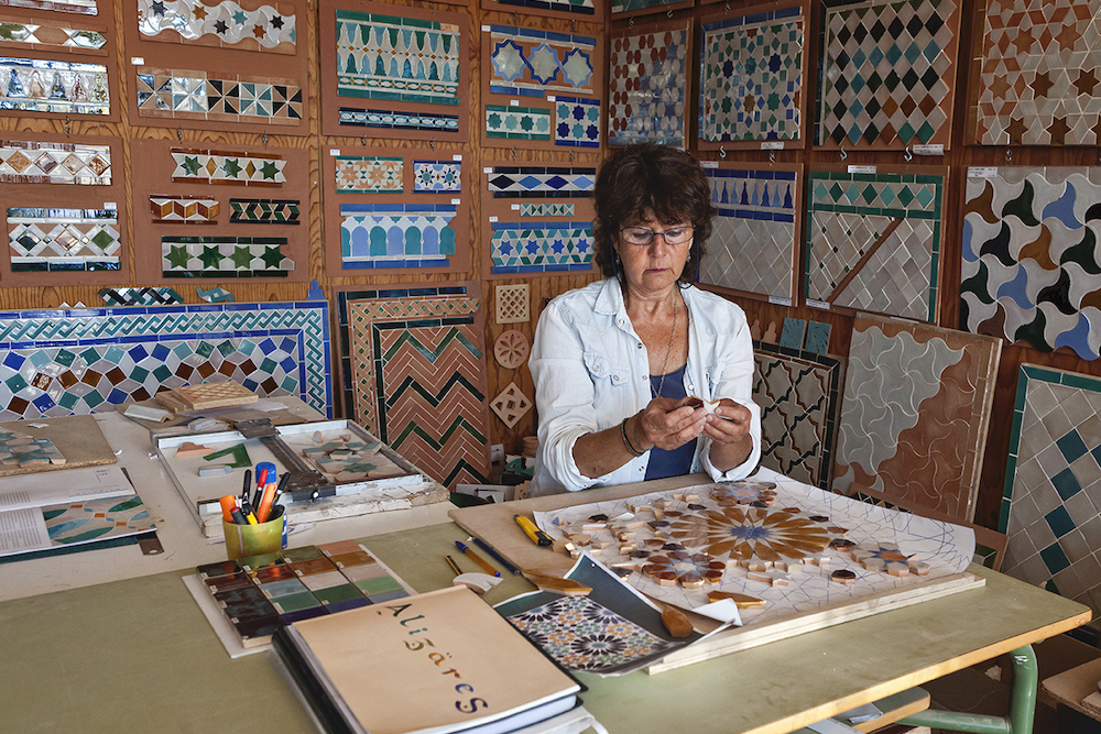 Bellow: Master in andalusian tilework Fátima Quesada de la Cuest tiles working in her workshop. Granada