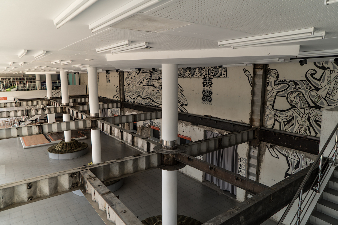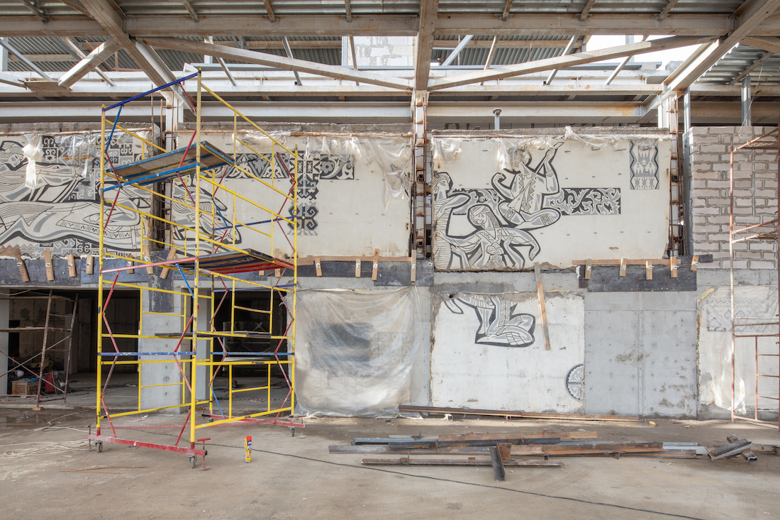 In 2017, the British architect Asif Khan was appointed to lead the renovation of Tselinny. His appointment followed his participation in Expo Astana, where he had won acclaim for his UK Pavilion. The architect’s first visit to Tselinny left him with the impression of a venue drained of its life force. Confronting radiant Tselinny’s diminishment into an ember, the renovation has taken a concerted approach that Khan likens to “cultural archaeology.” Tselinny’s layers have been peeled back, revealing details that have thrilled (e.g., the discovery of the original sgraffito beneath drywall) and frustrated (e.g., the finding that the foundation had to be redone).