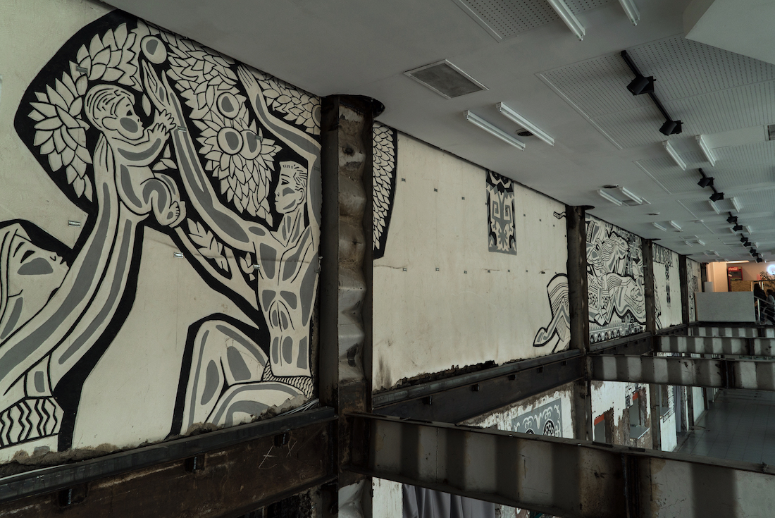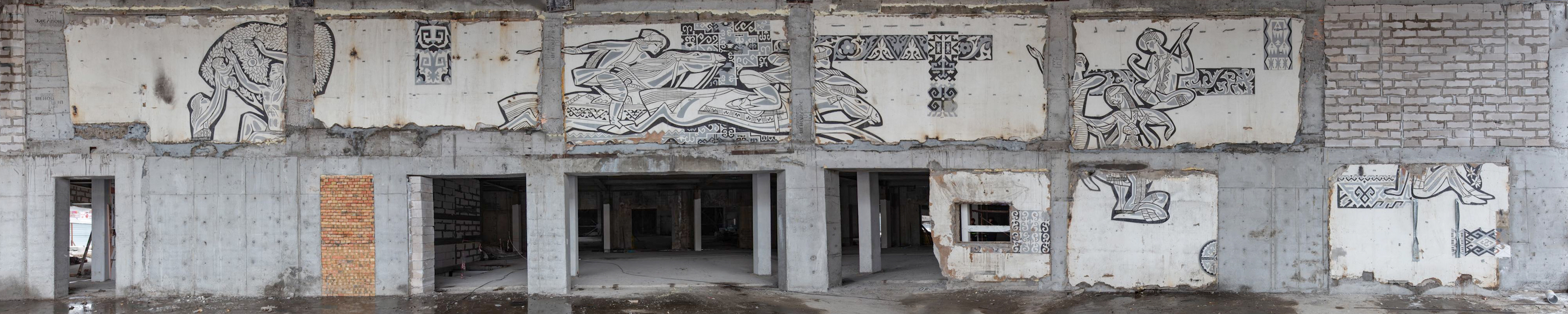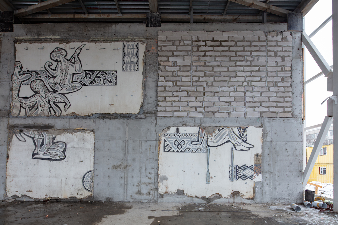 Tselinny’s association with that lapsed era of promise informed its eventual repurposing after the Soviet Union dissolved. The cinema creeped along in the 1990s before it was privatized at the dawn of the new millennium. The first private owners turned Tselinny into a multi-function space, adding a nightclub and other commercial ventures. In the process, the venue’s structural integrity was disturbed. Despite the objections of Sidorkin’s children and cultural activists, the glass screen was replaced and the sgraffito was covered. In a concession, Sidorkin’s son and his son’s wife were commissioned to make a replica of the sgraffito on the exterior of Tselinny. In a curious twist, many residents came to believe that the replica was the original.