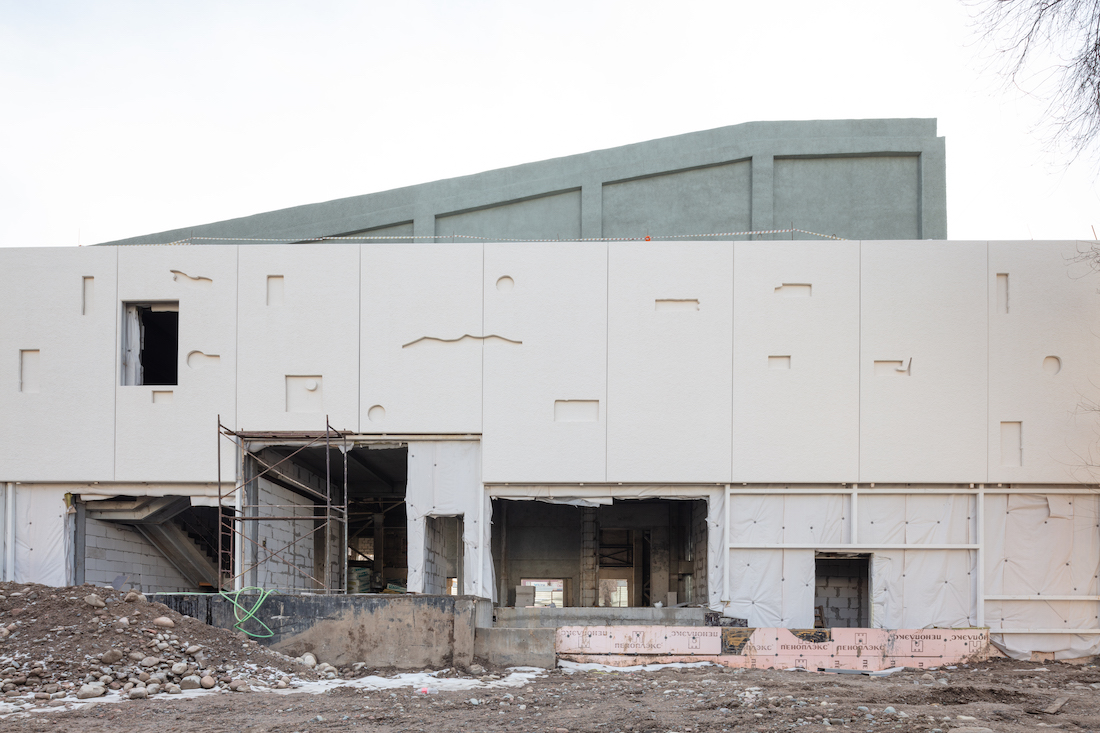 In conversation, Khan speaks of his desire not to replace historical material. This desire extends to his treatment of the replica of the sgraffito created for Tselinny’s exterior in the 2000s. The architect came to understand that, not only had many residents come to believe that the replica was the original, they depended on the replica as a wayfaring device. The replica marked where pedestrians should turn to access the church, park, and bazaar, enabling them to navigate the Golden Quarter while referencing images rather than words. The renovation of Tselinny honors this legacy by turning Sidorkin’s sgraffito into a visual language. The center is being covered in cladding inscribed with shapes based on the sgraffito’s constituent parts (e.g., a horse’s hoof). Further, in Tselinny’s forthcoming education wing, one of the windows has a distinctive cloud-like shape, which is molded on an element in the monumental artwork. Patrons will see through the sgraffito; more precisely, they will see through an abstraction of the work placed where its replica previously appeared.