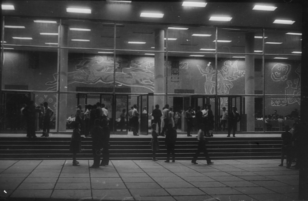 Tselinny’s architecture enhanced Sidorkin’s sgraffito, and vice versa. Because the façade was a glass screen, the atrium seemed like an extension of the sidewalk after sundown; the boundary between the world of exteriors and interiors was transparent, imparting that entertainment was for everyone. At night, Tselinny radiated; the cinema’s light spilled through the screen, and the sgraffito came alive. Pedestrians strolled by in tandem with the jumping horses while filmgoers communed with the family and couple in the garden of delights. Zhanna Spooner, an architect who grew up nearby, recalls that the effect was magical.