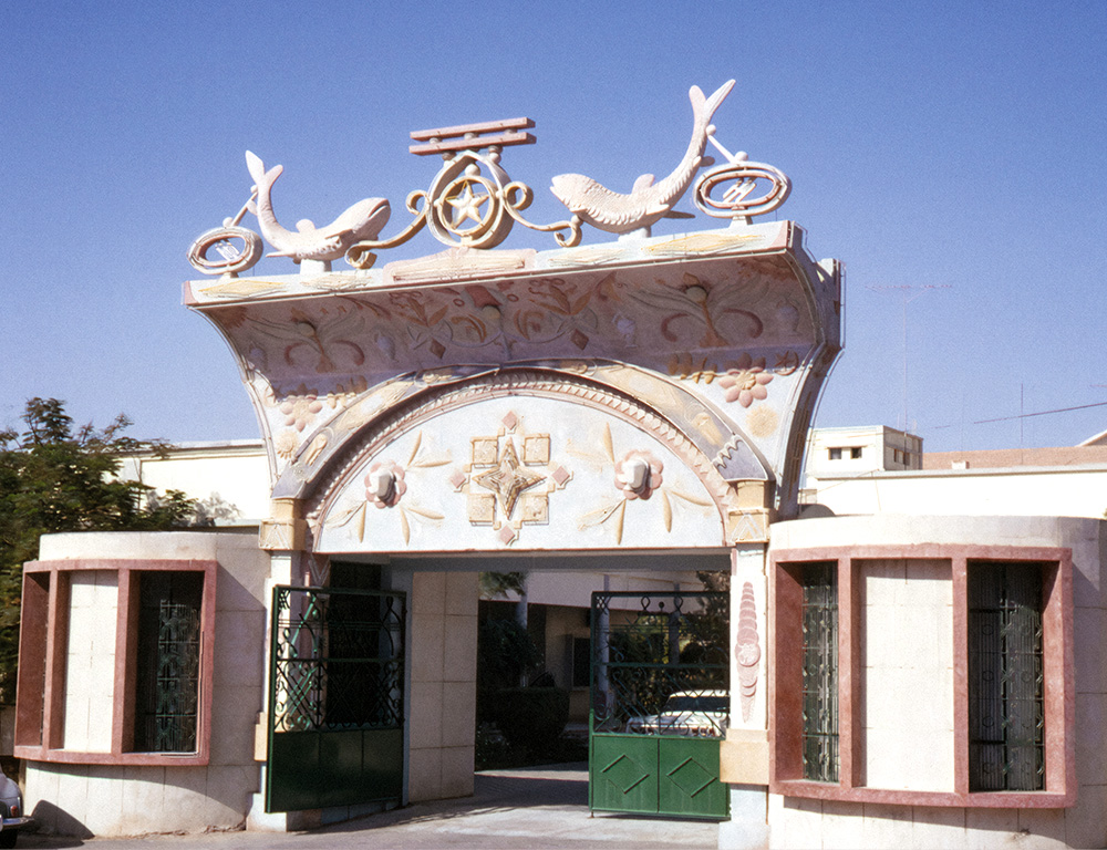 In the 1950s and '60s, various members of the royal family, the Al Thani, established new palaces near each other, which are among the most impressive monuments from the period. To single out one, I would mention the palace of Sheikh Ghanim bin Ali. Although much of the compound is off limits as it is still inhabited today, one can freely admire its east portal, which initially served as the public entrance. It was made entirely of terrazzo, adorned with a rich array of decorative details, blending typical Art Deco elements with local motifs. Additionally, the top of the portal once boasted two fish statues, which must have wowed many by-passers as long as they were in situ.