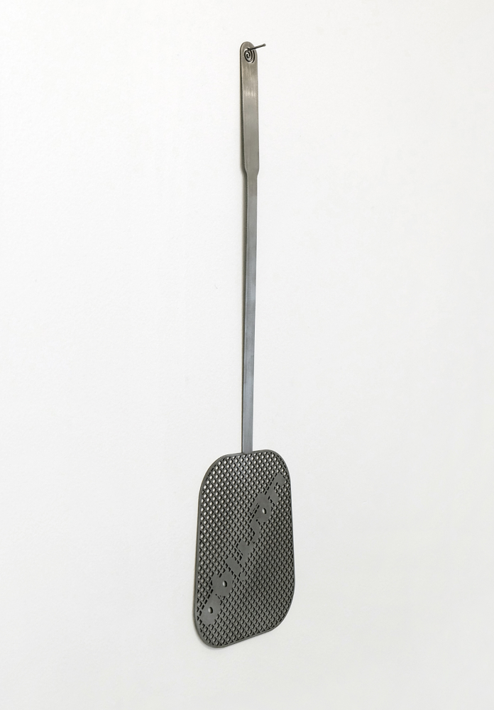 Right: Lorin Mai, Flycatcher, a common household item that symbolizes humanity's "third hand." In the "Yasna" ritual, a similar ladle places sandalwood into sacred fire. This object embodies dualism, representing both existence and non-existence through the beaten fly and burnt wood.