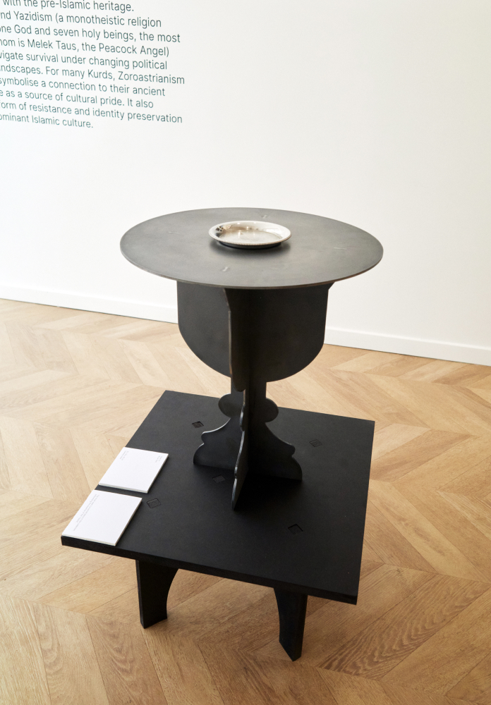 Lacking both funds and connections to engage a curator, I took on both roles—participating artist and curator. As a curator, I decided to invite photographer Eugenio Grosso to exhibit his project about the Lalesh Temple, a Yezidi pilgrimage site. His photographs naturally complemented my narrative about Yezidi Kurds. Sharing this aspect of Kurdish culture is vital to me, as Yezidism and Zoroastrianism represent forms of resistance and identity preservation for many Kurds against the backdrop of dominant Islamic culture. Following the mass Islamization of Kurds as early as the 7th century, these religions now symbolize a connection to ancient history and serve as a source of cultural pride.