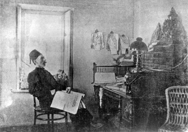 Снизу: Исмаил Гаспринский за работой в Бахчисарае. Он же с азербайджанскими общественными деятелями Гасан-беком Зардаби и Алимардан-беком Топчибашевым