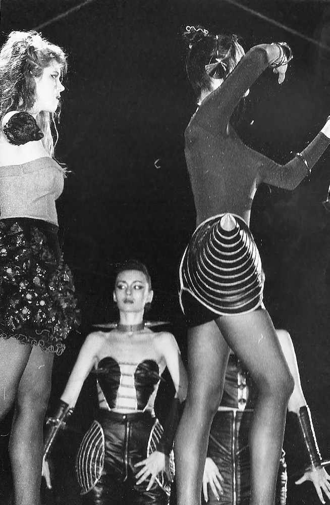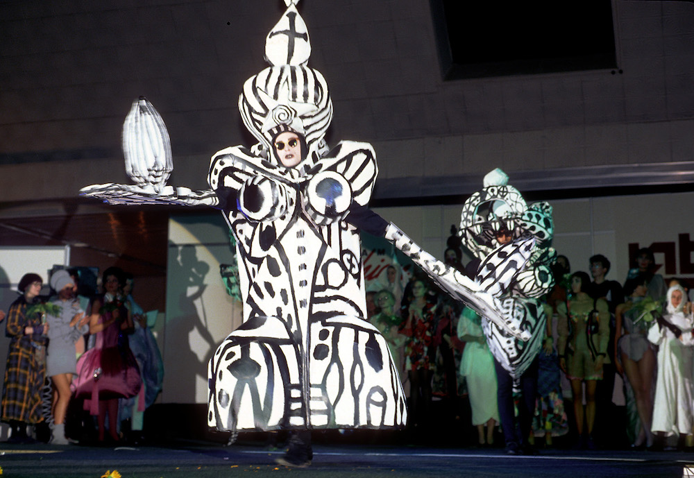 К середине 1990-х годов в «Ассамблее» свои эпатажные коллекции показало уже более 150 дизайнеров. Они приезжали туда из разных уголков мира вместе с архитекторами и художниками, занимающимися перформансом, — всех участников объединял интерес к костюму, телу и его изменчивости. Художники из социалистических республик могли без труда найти себе союзников среди коллег, приехавших с Запада. Там проводили показы –– назову только несколько имен –– Катя ФилипповаКатя ФилипповаМодельер, начавшая свою карьеру в 80-х с провокационных коллекций одежды, в которых использовалась военная атрибутика, шапки-ушанки, валенки и красные звезды. и Андрей БартеневАндрей БартеневМультидисциплинарный художник, известный экспериментальными провокационными перформансами, инсталляциями, театральными костюмами и кураторскими проектами. из России, британский художник и основатель конкурса красоты «Альтернативная мисс мира» Эндрю Логан, французский модельер Пако Рабан.