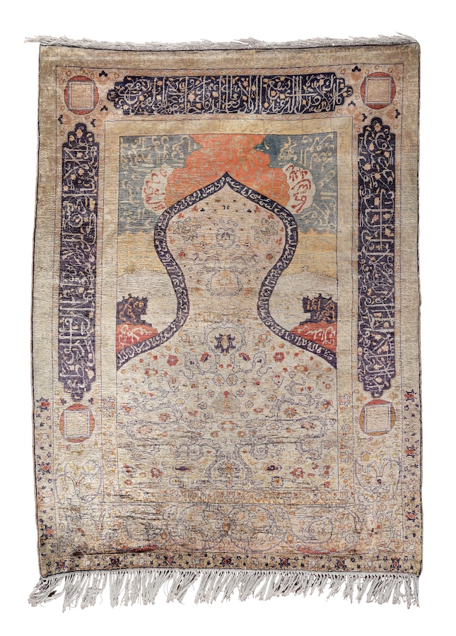 Молитвенные коврики служат для индивидуального намаза, сохраняя чистоту в соприкосновении с полом или землей во время ритуала и отделяя молящихся от внешнего мира. Техника исполнения ковров, иногда с введением золотых или серебряных нитей, отличается невероятно тонкой проработкой. Шерстяной ковер, выполненный на мануфактуре Кашана в начале ХХ в., демонстрирует типичную «медальонную» композицию с цветочными и анималистическими мотивами. Между ними зеркально расположены дикие звери, среди которых узнаются львы, леопарды, гепарды, тигры, лани, козлы. Рисунки подобных ковров имеют сходство с книжной миниатюрой, что не случайно, поскольку картоны для них нередко заказывали именно художникам-миниатюристам.
