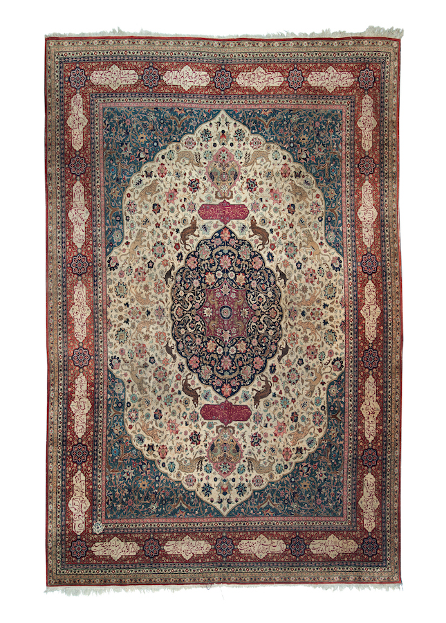 На этом иранском ковре, вытканном с использованием узла «сене», чередующиеся медальоны и фигуры животных дополнены орнаментом в виде стихов на фарси.