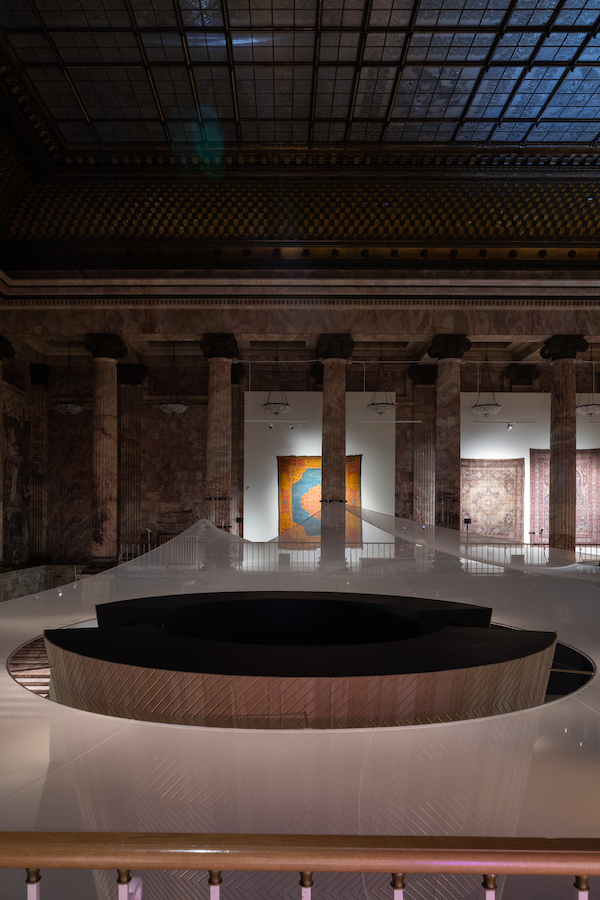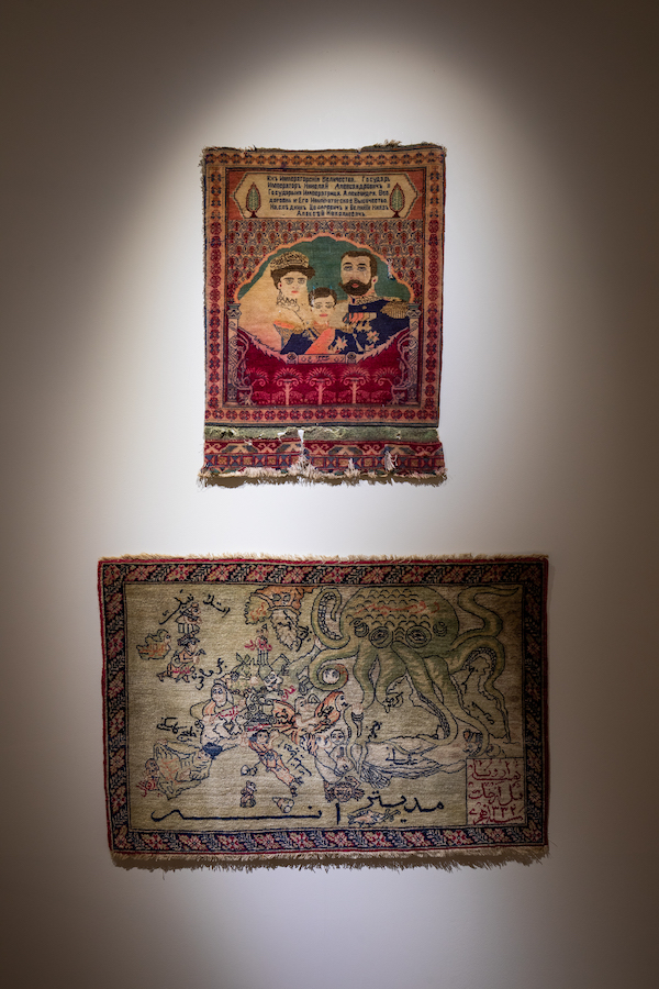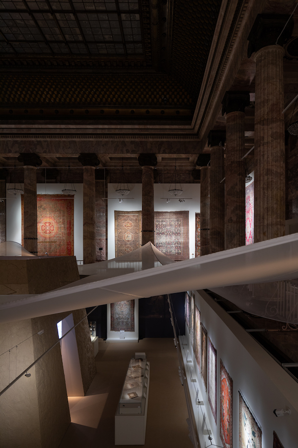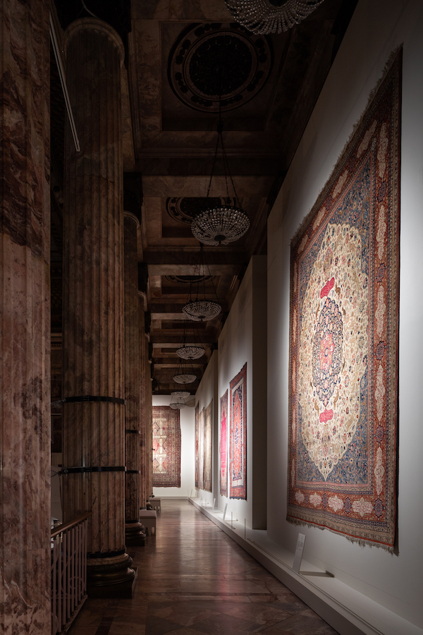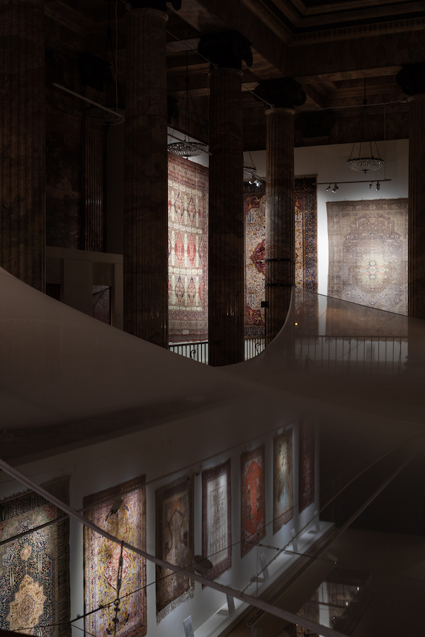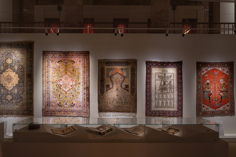 Восточные ковры — собирательное название этих изделий из шерсти (овечьего, верблюжьего, козьего волоса), хлопка, шелка, льна, происходящих из различных стран Азии и Ближнего Востока. Техника вязания ковров практически не менялась на протяжении столетий, хотя переносные станки кочевников были более простыми, чем стационарные станки в мастерских и на мануфактурах. Декорирование произведений совершенствовалось по мере роста опыта ковроделов, а выбор композиций и расцветок зависели от места и времени их создания. Представленные ковры изготовлены в центрах художественных ткачеств Турции, Ирана, Индии в XVIII — начале XX в. Ранним экземпляром является молитвенный коврик, сотканный в Турции в XVIII в. Его центральным мотивом стало изображение михраба (молитвенной ниши), ориентированного на Мекку, или киблу, в окружении писаний Корана.