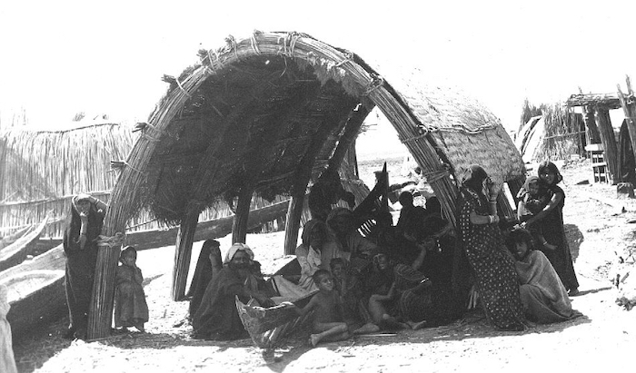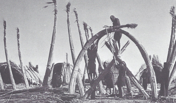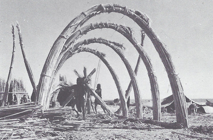 Вероятно, идея использования параболических сводов в архитектуре происходит из опыта применения тростника на юге Ирака, болотистая местность которого изобилует этим растением. Примеры архитектурных сооружений из тростника есть у болотных арабов (жителей месопотамских болот на границе Ирака и Ирана. — Пер.). Противоположные стены соединяются наверху, формируя крышу. Согнутые стебли тростника естественным образом принимают форму параболы, придавая всей конструкции прочность яичной скорлупы. Похожий пример, но выполненный в самане, можно встретить в поселении Фарис в Верхнем Египте. Он почти в точности повторяет структуры из тростника. Сходство настолько очевидно, что не может быть совпадением: Египет не видел домов со сводами из тростника с глубокой древности. Можно предположить, что прототип кирпичной постройки был сделан из тростника.