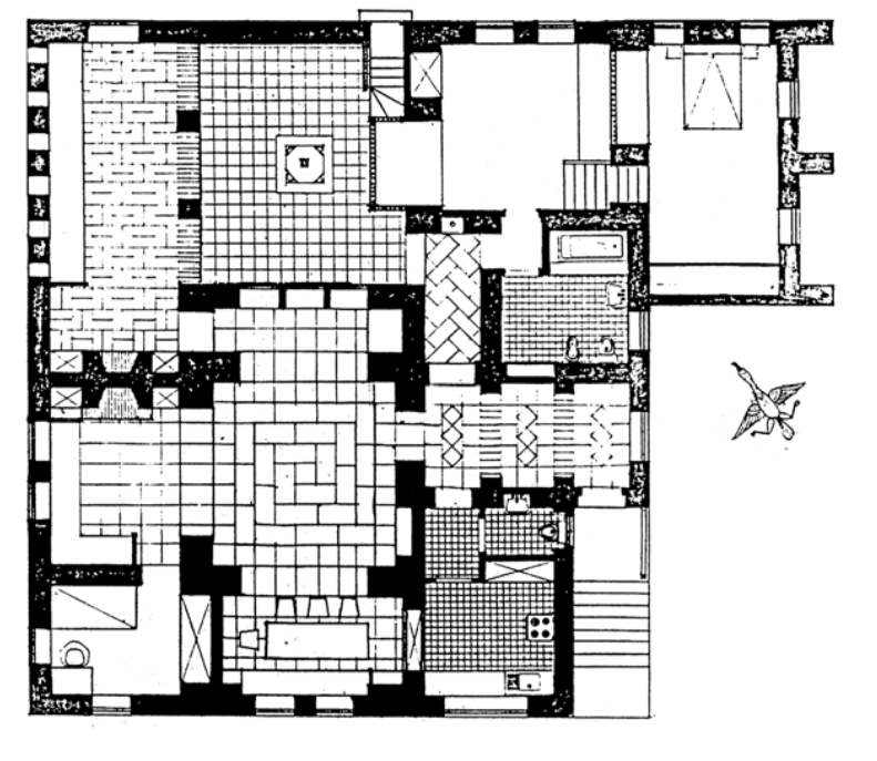 1. Центральная комната с куполом. Планировка арабского дома по принципу ка: центральная комната с куполом и примыкающий к ней айван, накрытый сводом. Пристройка с левой стороны — патио с двумя айванами, которые накрыты сводами.