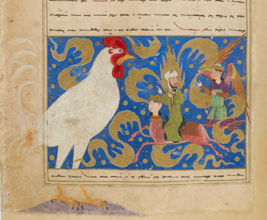 Лист 11r: «…Я увидел белого петуха. Его голова была под троном [Аллаха], а его ноги крепко вцепились в землю. Я спросил Джибриля: “Что это за петух?” Джибриль ответил: “Этот петух — ангел, что считает часы дня и ночи. Когда приходит время молитвы, он кричит и произносит тасбих (формула «Субхан-Аллах», означающая «пречист Аллах», и молитва с повторением этой формулы). Услышав его голос, земные петухи также кричат и произносят тасбих”».