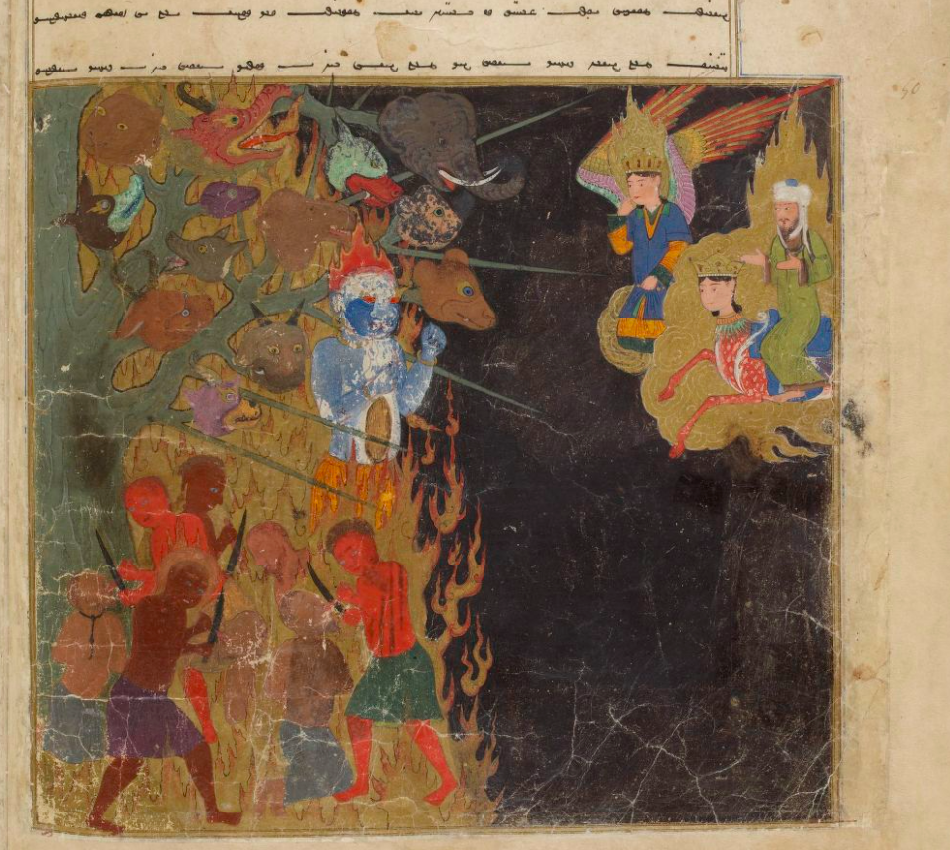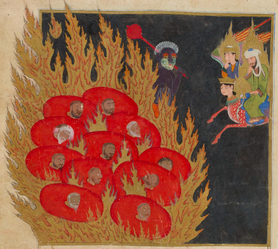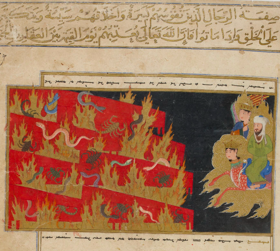 Лист 59r: «Я увидел другую группу женщин в аду, подвешенных за волосы. Из их носов выбивались языки пламени. Я спросил: “Кто эти женщины?” Джибриль ответил: “Это женщины, которые показывали свои волосы na-mahram (тем, кто не входит в число махрам — близких родственников, за которых женщина не имеет права выходить замуж по причине их родства, но с которыми имеет право оставаться наедине и отправляться в путешествие). Те, кто видел их [волосы], возжелал их. Злодеяния свершились между ними, не убоявшимися этого Дня [Судного]”».