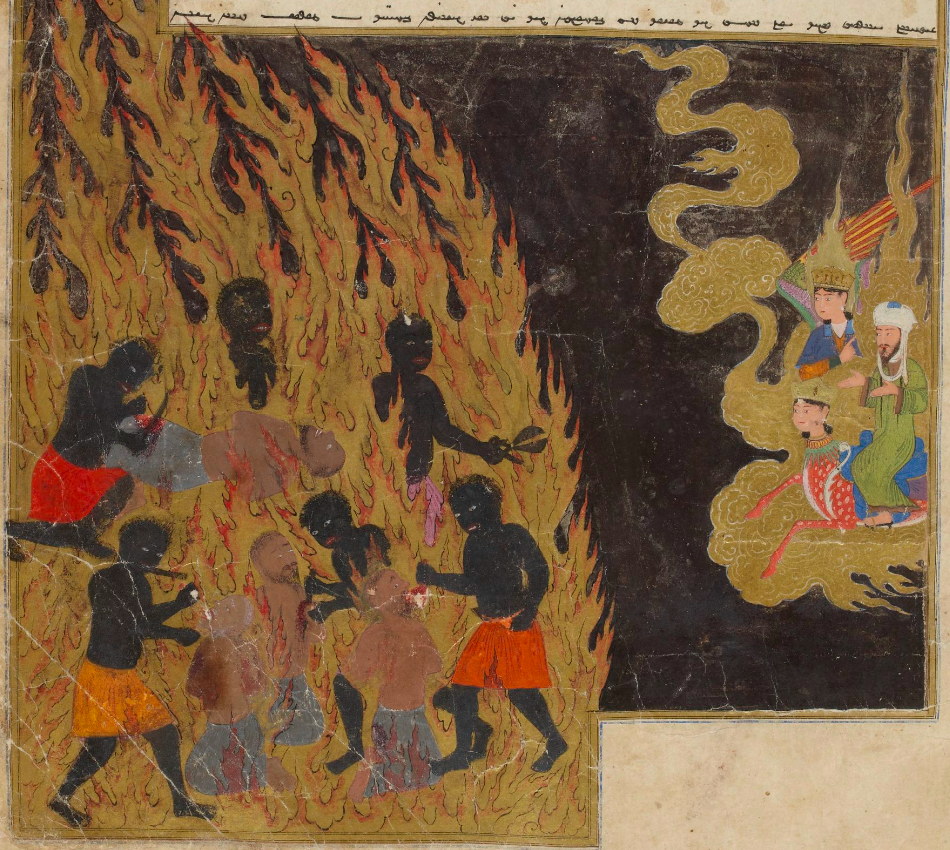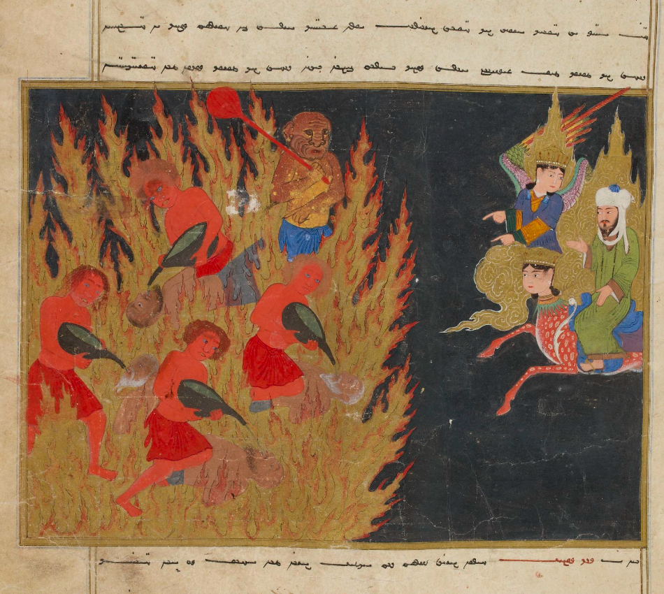 Лист 61r: «Я увидел другую группу людей, которых ангелы пытали, вливая яд в горло. Он [яд] выливался из их задов. Я спросил: “Что сделали эти люди?” Джибриль ответил: “Это люди, которые завладели вещами сирот, не боясь этого Дня [Судного]”».