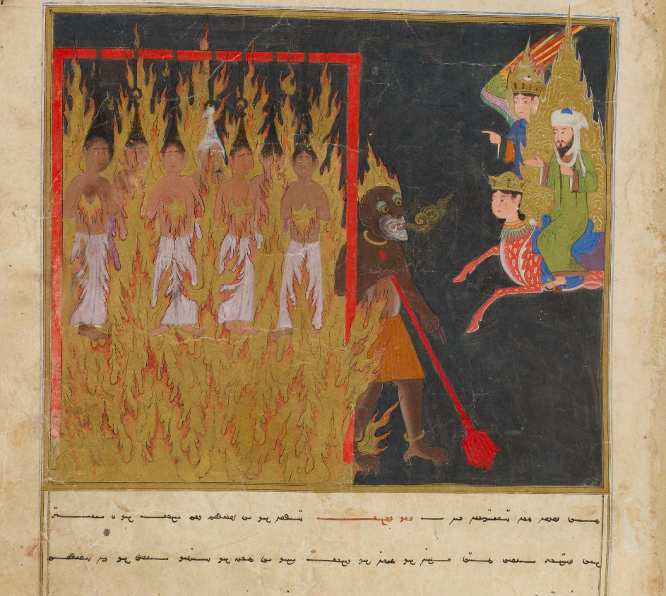 Лист 53v: «Затем я увидел дерево в аду. Его размер равнялся пяти сотням лет пути, его шипы были как пики, а его плоды — как головы демонов. Джибриль сказал: “Это дерево Заккум. Его плоды горче, чем яд. Люди в аду едят их. Они не задерживаются у них внутри, но проходят насквозь”. Под деревом я увидел группу людей. Ангелы мучили их отрезая языки. Языки вновь отрастали, и их вновь отрезали. Я спросил: “О Джибриль, кто эти люди?” Джибриль [ответил]: “Это те образованные люди (culama’), что говорили другим: “Не пейте вина, не прелюбодействуйте и не творите злых и извращенных дел”, — а сами, не следуя собственным принципам, совершали эти предосудительные и безнравственные поступки”».