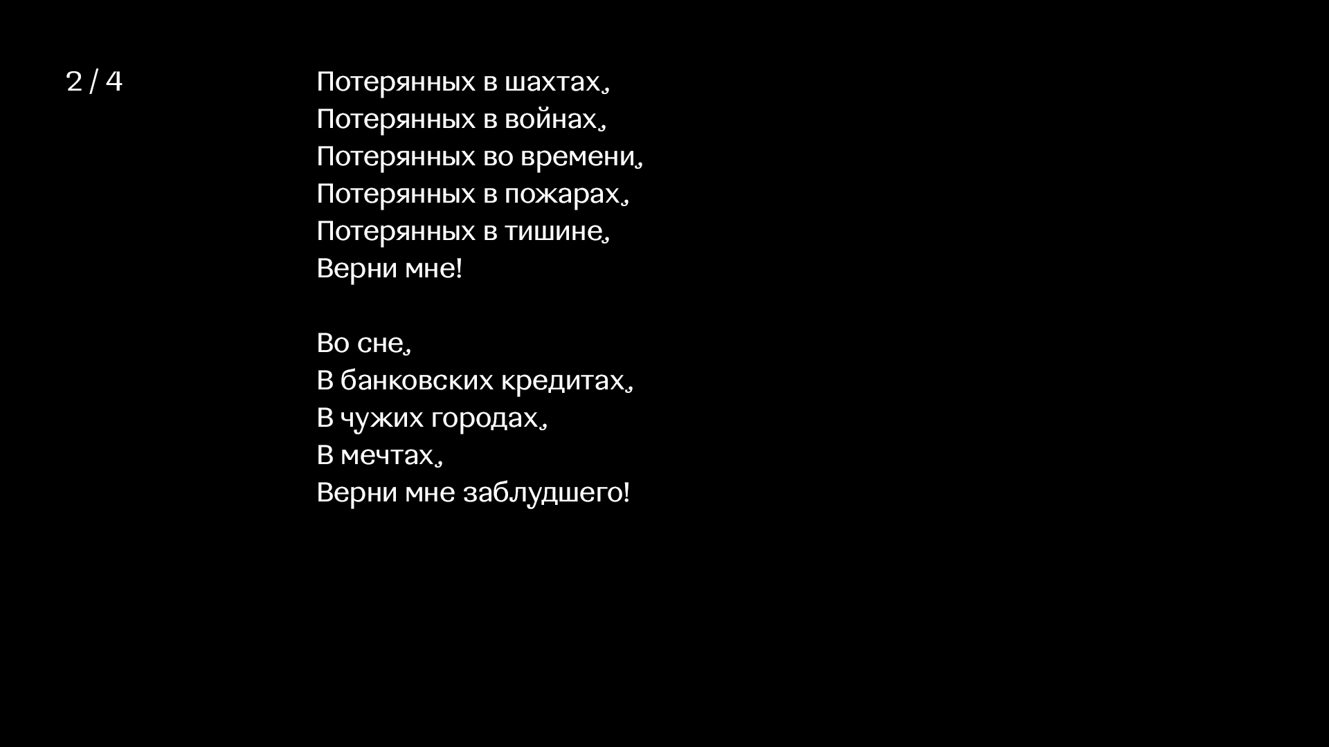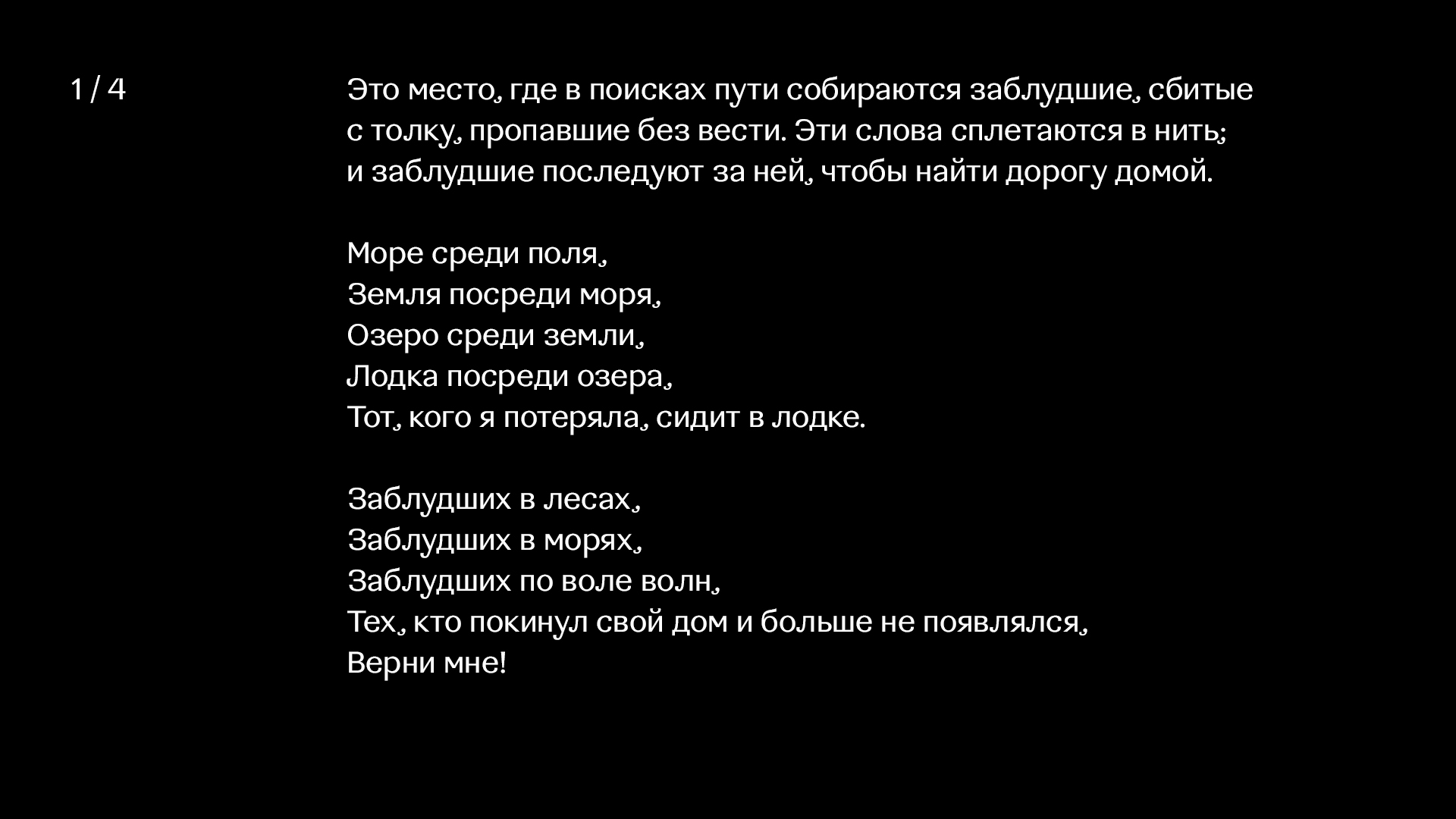 Места, которые мы создаем, на самом деле не существуют. Но если хорошо приглядеться, в них можно узнать Тбилиси. Город, полный ошибок и тайн. Город утерянных садов, советских микрорайонов, заброшенных строек, город слез, страха и любви, серый, пыльный город. И если в этих описаниях и чувствах можно узнать и другие города, то значит, эти стихи (так мы называем наши видео) и о других городах тоже. Близко или далеко, на Востоке или на Западе, во всех направлениях. Они о любом городе, о любых чувствах, о любом состоянии. В наших работах, будь то анимационные видео или документальные, мы переводим политические и личные чувства в изображения и слова, превращаем их в знаки.