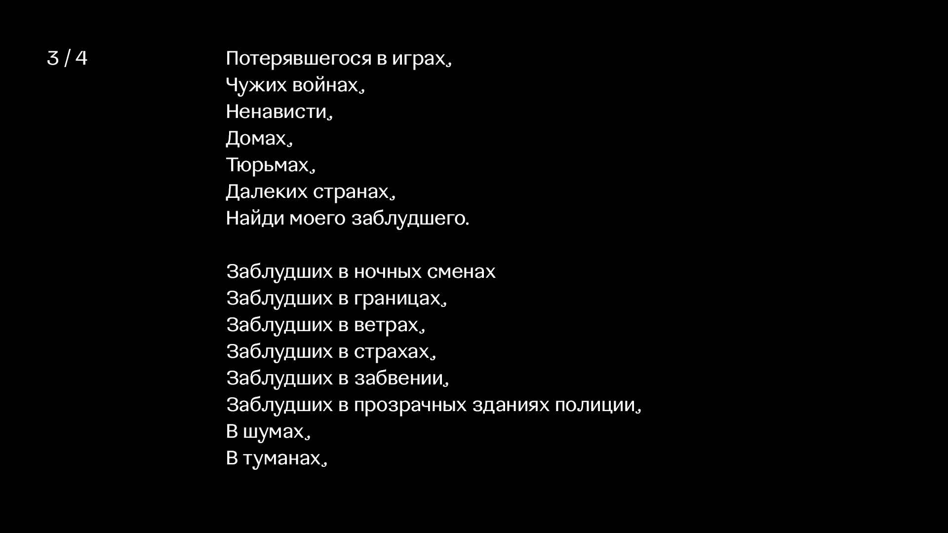 Наконец, если описать несколькими словами то, что нас интересует, и то, о чем мы думаем, то это: города и люди, границы, современные ритуалы и мифология, гетеротопии, неместа, забытые и потерянные истории, состояния, обусловленные современной политикой и одиночеством. То, что остается, но невидимо, то, чего мы боимся и о чем не хотим говорить.