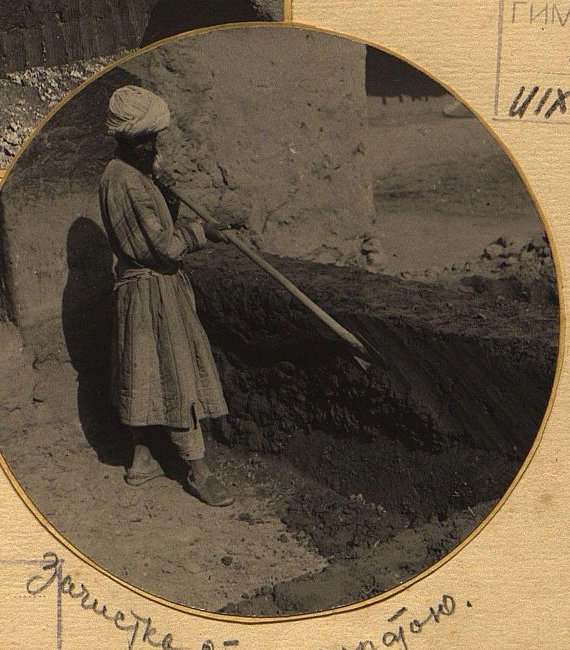 Cправа: Постройка глинобитного дома. Зачистка стен лопатой. Узбекистан, 1914 год